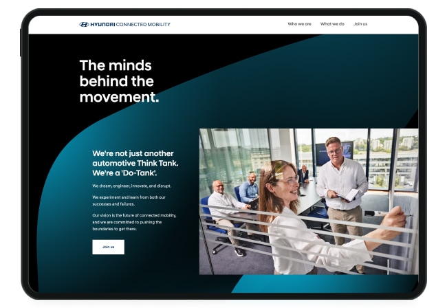 Zum Zeitpunkt der Gründung war die Einheit nach außen wenig sichtbar. Es fehlte ein digitaler Auftritt, der Hyundai Connected Mobility als Teil der Hyundai Motor Group verortet, gleichzeitig aber ihre progressive, kollaborative und zukunftsgerichtete Arbeitsweise erkennbar macht – insbesondere für die internationale Connected-Mobility‑Community und potenzielle neue Talente.